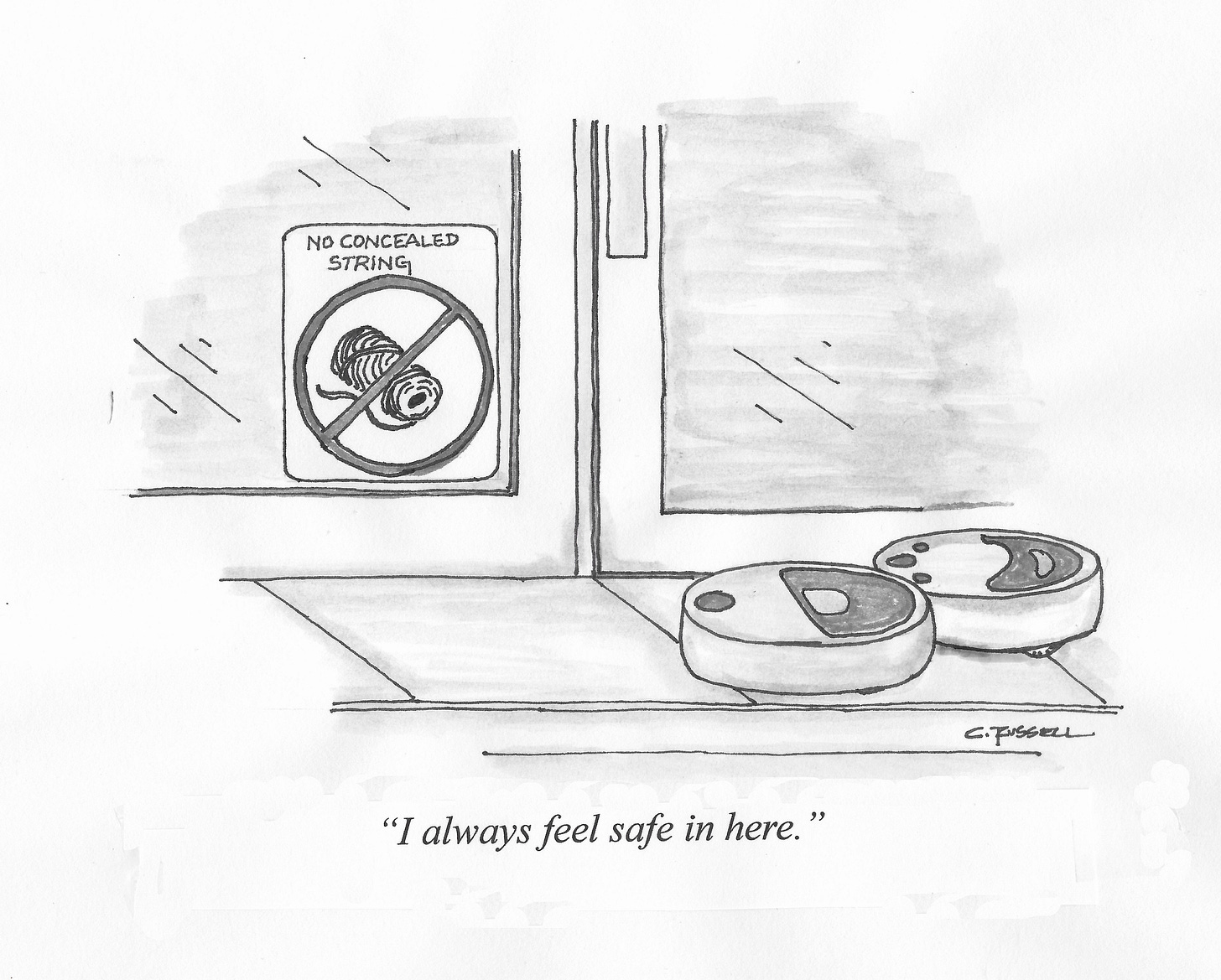 Prompt: blob:https://discord.com/2cd49fb4-cbfc-4487-92bc-efe19e05d594 black and white ink cartoon of 2 flat roomba vacuums on a sidewalk looking at a door to a store with a single large sign in the window that says 'no concealed string' with a spool of twine with a strike through it. The string prohibition sign is larger and the spool can be easily identified. There is no spool of twine on the sidewalk.--v 6.0